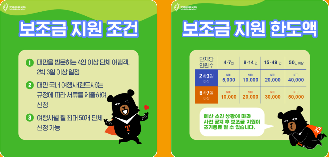 개인투어는 2박 3일 이상 일정으로 대만에 체류하고 여행지원금은 1인당 대만달러 NTD5,000(한화 약 21만원)의 비용이 지원됩니다. 여행사 단체투어는 최소 4명 이상이 2박 3일 이상 일정으로 대만에 체류하면 됩니다. 여행지원금은 투어 그룹 인원과 체류기간에 따라 투어 단체 당 대만달러 NTD5,000~NTD50,000의 비용이 지원됩니다