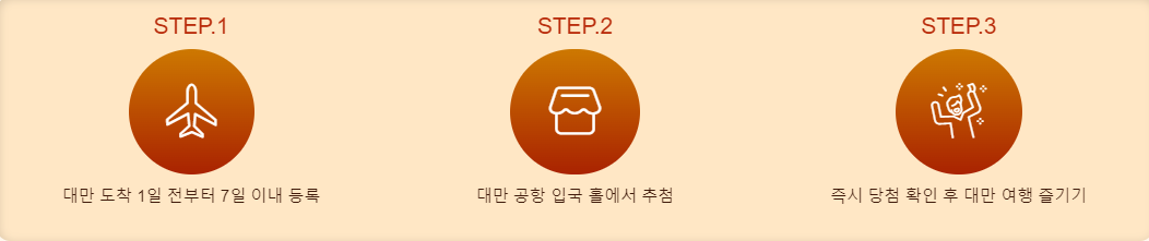 대만 도착 후 이벤트 참여 시 이메일로 발송된 QR 코드를 공항 입국 홀의 이벤트 데스크에 보여준 뒤, “행운을 부르는 대만 여행 Taiwan the Lucky Land” 자유여행객 대만 방문 소비지원금 대만달러 5,000NTD 추첨 이벤트에 참여합니다. 해당 공항은 타오위안 국제공항 (제1청사 및 제2청사), 타이베이 송산 공항, 타이중 및 가오슝 공항 등 포함입니다. 이벤트 참여 완료 후 발송된 QR 코드를 이벤트 데스크에서 태블릿으로 스캔 후에 추첨 페이지에서 바로 추첨 진행합니다.
