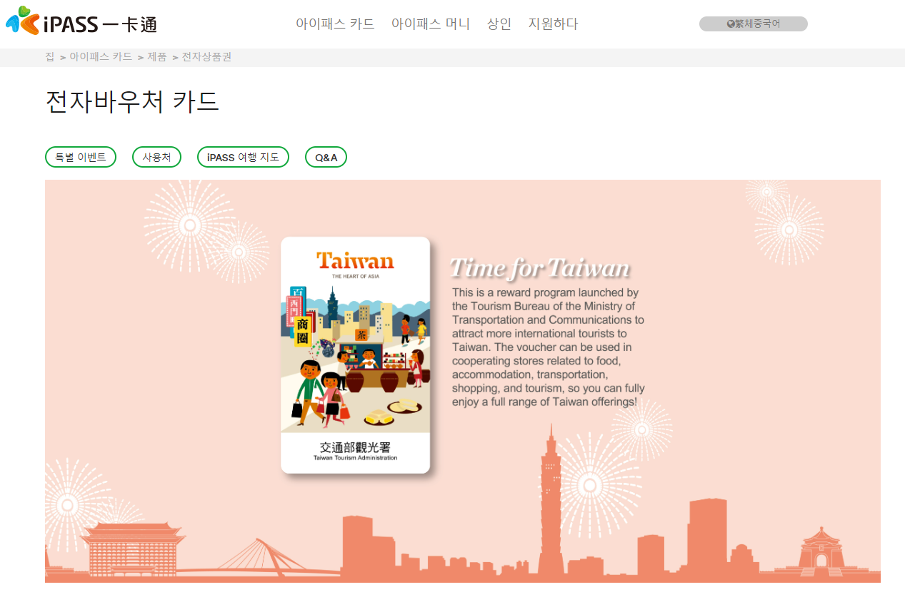대만 여행지원금은 개인투어인 경우 대만 달러 5,000NTD상당의 '전자 바우처' 또는 숙박 할인쿠폰'으로 지급이 됩니다. 사용 기한은 수령일로부터 90일입니다. 전자바우처는 대만 내 소액 결제를 제공하는 특약상점에서 사용할 수 있으며, 1회 사용 한도는 대만달러 1,000NTD, 1일 사용한도는 3,000NTD입니다. 사용 기한 이후 미사용 금액은 모두 교통부로 귀속됩니다. 만약 전자바우처를 유실, 도난 또는 훼손할 경우, 교환 또는 환불을 요구할 수 없습니다. 아이패스와 이지카드는 지하철, 버스, 기차, 택시, 편의점, 대형커피숖 등에서 사용이 가능한데 이지카드의 사용처가 더 많아서 보통 이지카드를 선호한다고 하니 참고하시고 원하시는 편의점이나 식당에서 사용할 수 있는지는 아래 전자바우처 바로가기를 통해 확인하실 수 있습니다.