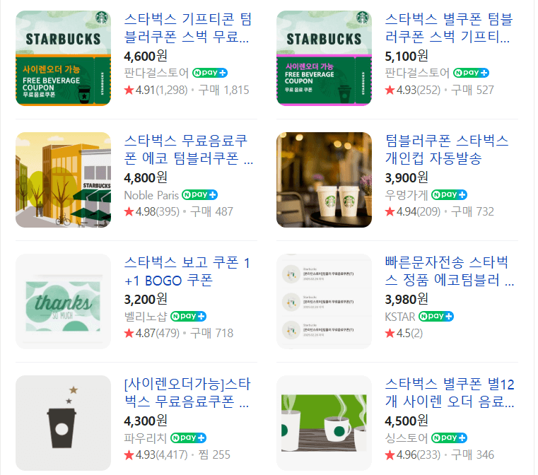 스타벅스 텀블러 쿠폰은 특정 사이즈의 음료를 4000원에 구매할 수 있는 쿠폰입니다. 이 쿠폰은 주로 중고 거래 플랫폼이나 온라인 사이트에서 구매할 수 있으며, 쿠폰을 소지하고 있으면 추가 금액 없이 원하는 음료를 맛볼 수 있습니다 네이버 쇼핑에서 텀블러쿠폰 스타벅스로 검색해도 굉장히 많은 항목들이 뜨고 있습니다. 여기에 네이버 멤버십이라면 추가 할인 시 3000원 초반대로도 가능해집니다. 특히 SNS를 통해 이 정보가 확산되면서 많은 사람들이 이 혜택을 누리고 있습니다.