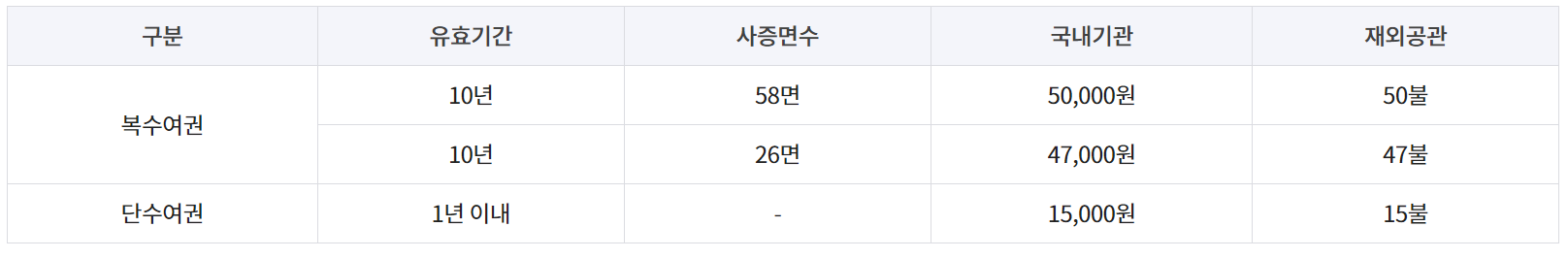 여권 발급 비용은 년수나 사증면수에 따라 비용이 달라집니다. 18세 이상인 사람이 복수여권을 신청하는 경우에는 유효기간이 10년인 여권이 발급되며, 기간 선택은 불가합니다. 사증면수에 따라 금액이 틀리지만 3,000원 정도 차이면 58면으로 선택하는 것이 좋겠습니다. 그만큼 해외여행도 많이 다닐 수 있겠죠?