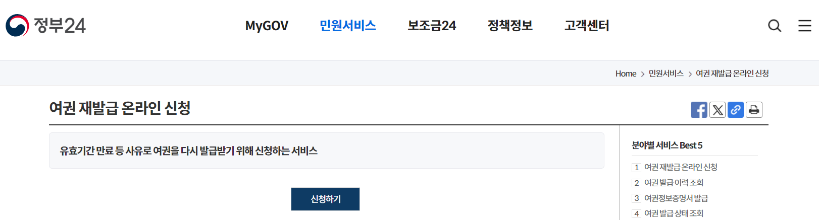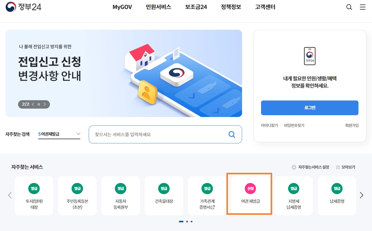2. 위 사진처럼 자주 찾는 서비스 중 '여권 재발급'을 선택하세요.